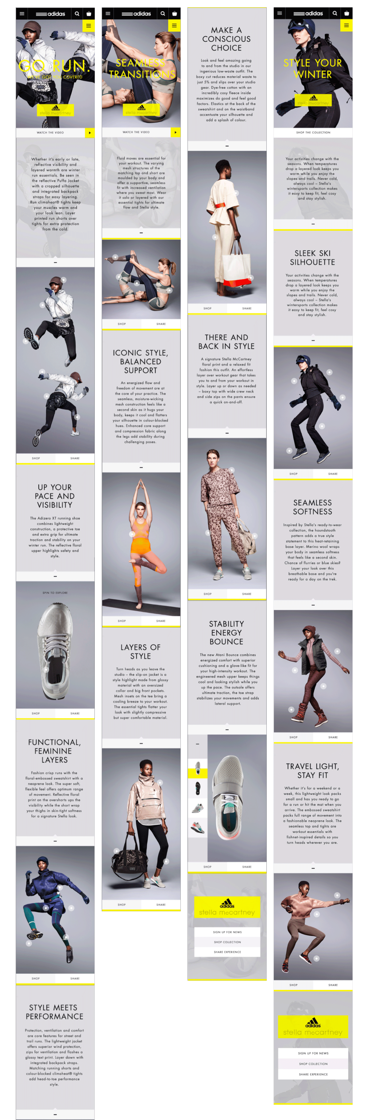 In September 2004, adidas and Stella McCartney announced a long-term partnership presenting the adidas by Stella McCartney sport performance collection. This was the first time that a high-end fashion designer created a functional sport performance range specifically for women.